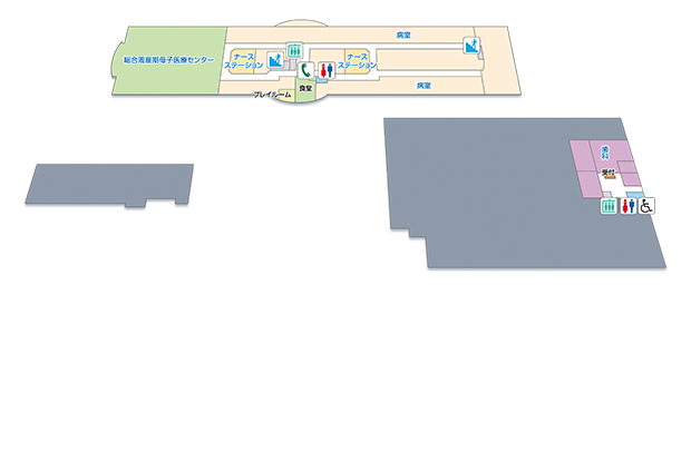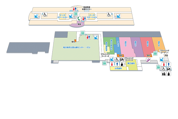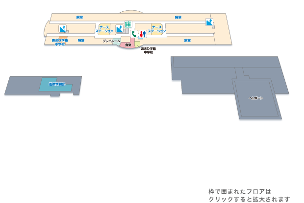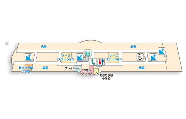 | 6F | 病室/あさひ学級 | ヘリポート | 医療情報部 | ||