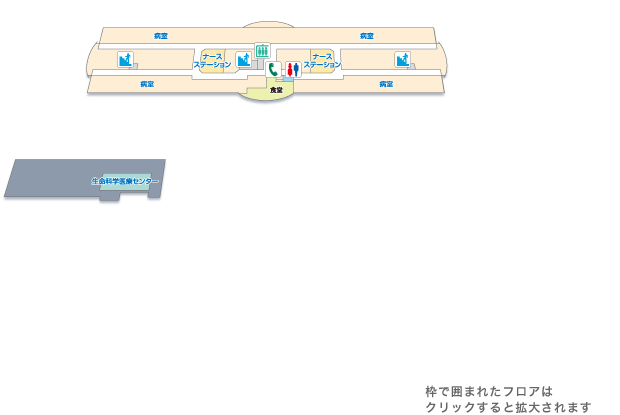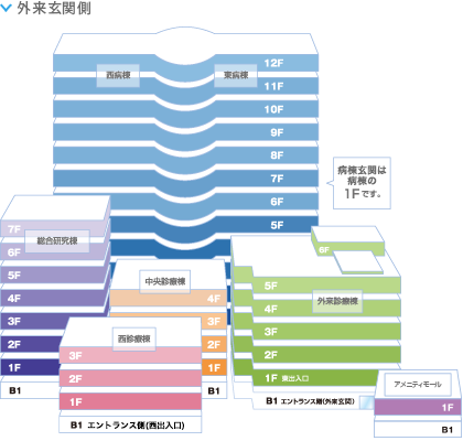 | 病棟 | 外来診療棟 | 中央診療棟 | 西診療棟 | 総合研究棟 | |