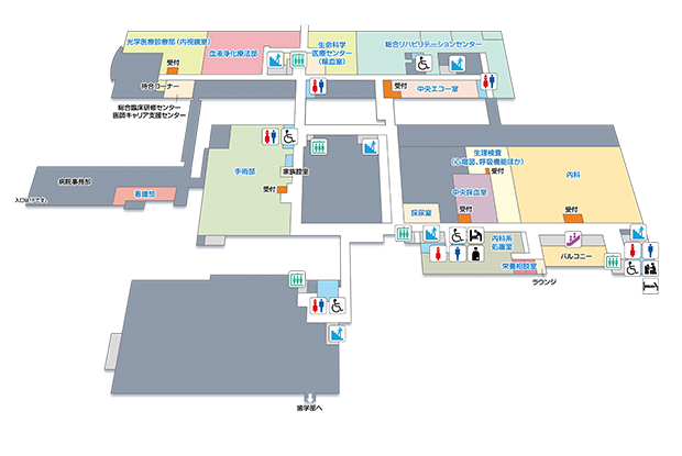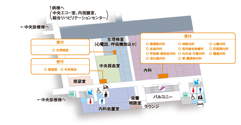 循環器内科/内分泌・代謝内科 血液内科/腎・膠原病内科 呼吸器・感染症内科 心療内科 消化器内科 肝胆膵内科 脳神経内科 腫瘍内科 医科総合診療部 検査部/中央採血 生理検査 リハビリテーション科(東病棟2F) |