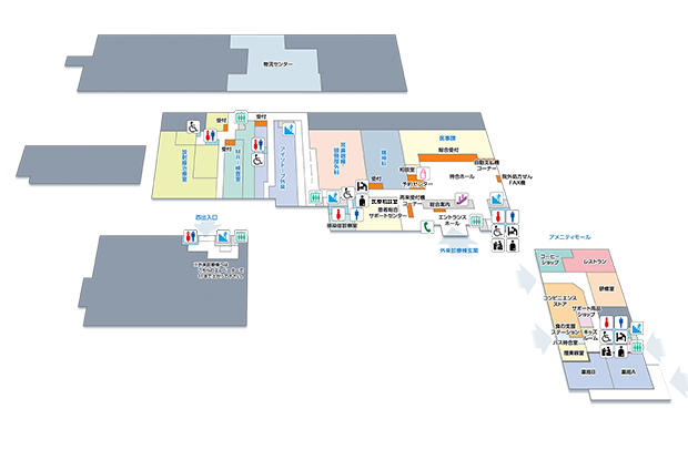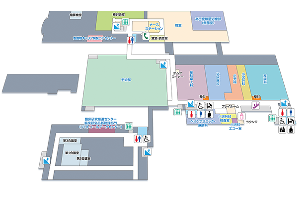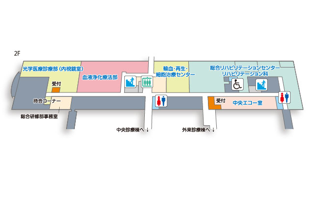 | 2F | 光学医療診療部 血液浄化療法部 総合リハビリセンター 総合臨床研修センター 中央エコー室 |