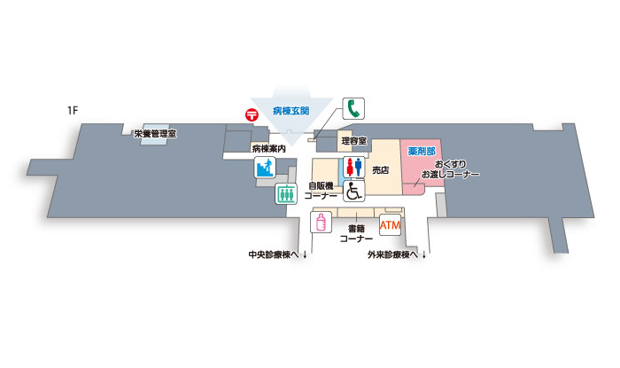 | 1F | 病棟玄関 薬剤部 売店 |