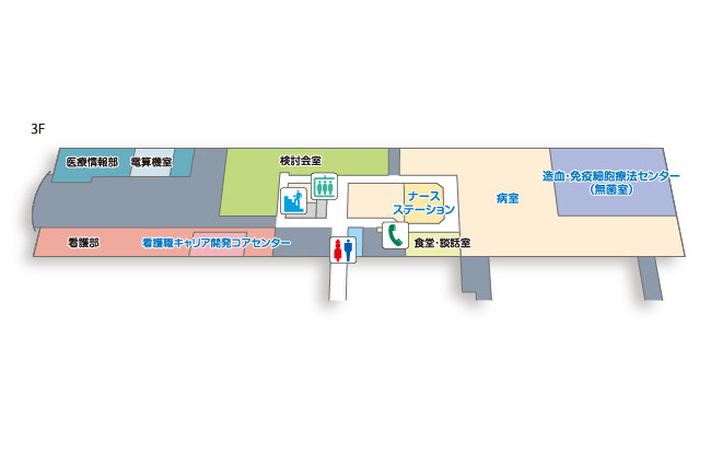 | 3F | 病室 高密度無菌治療部(無菌室) 医療情報部(電算機室) 看護職キャリア開発コアセンター/検討会室 |