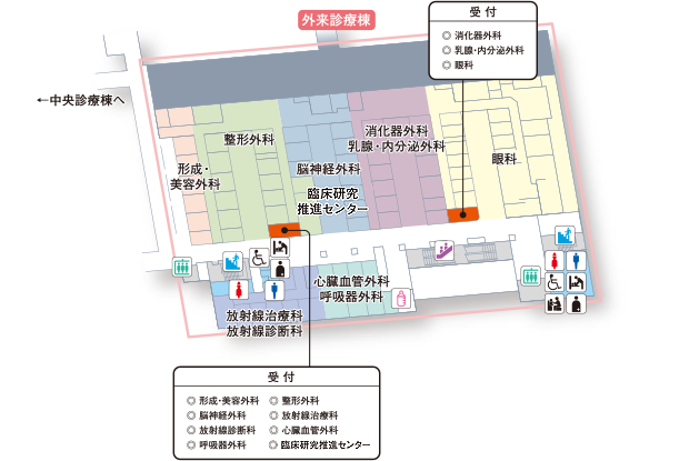 形成・美容外科 整形外科 脳神経外科 乳腺・内分泌外科 消化器外科 眼科 放射線治療科 放射線診断科 心臓血管外科 呼吸器外科 臨床研究推進センター |
