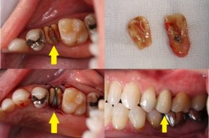 神経を取った後の歯はファイバー等を使用して根を補強してから冠を被せる治療が一般的です。ところが、神経を取った歯に咬む力が強くかかると、根にひびが入ったり割れたりすることがあります。その場合、歯茎が痛み、膿が出たりするばかりか、長期に放置すると根の周囲の骨が吸収してしまうので、現状では抜歯になるのが一般的で、歯を失う大きな原因の一つとなっています。当外来では10年以上前から、縦にひびが入るか、割れてしまった歯根を一度抜歯して、接着剤で元通りに修復し、再度元の位置に植え直す処置を行っています。これまでにこのように治療した歯は3年経過後に約8割、5年経過後に約7割使えています。場合によっては抜かずにひびを修理する簡単な手術をすることもあります。もちろん、このような対応ができない場合もありますが、エックス線撮影等の検査によってその可能性はある程度判断できますので、是非ご相談ください